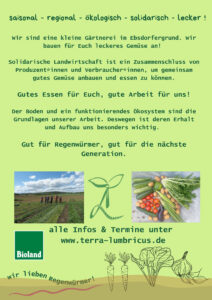 Die SoLawi Terra Lumbricus aus dem Ebsdorfergrund mit Verteilorten in Marburg, Gießen, Mainzlar, Wißmar, Leidenhofen und Amöneburg geht ab Mai in die nächste Saison und es gibt noch freie Anteile zu vergeben.